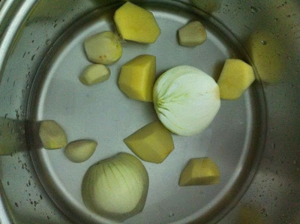 La patata pelada y troceada y la cebolla pelada partida por la mitad...