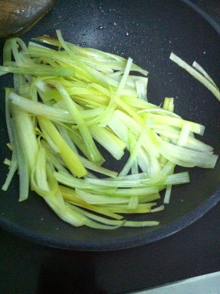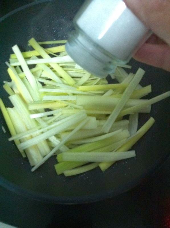 Una vez tome temperatura, añadiremos las laminas de puerro, salaremos y doraremos.