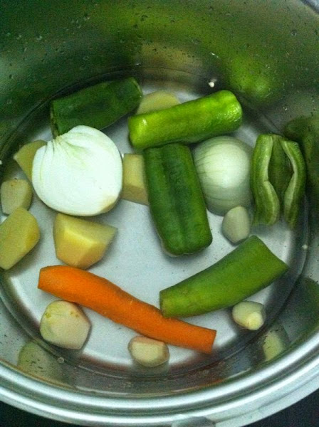 Mientras los puerros están en el agua, pondremos en la olla express un chorro de agua,no demasiada a temperatura media en el fuego.