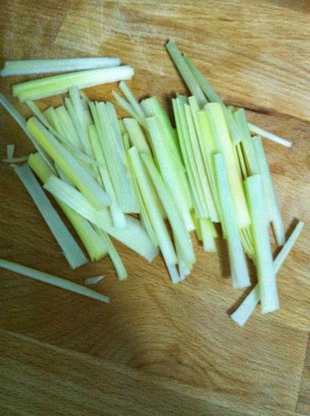 Mientras batimos todo, cortaremos en láminas finas el tronco de puerro que hemos reservado antes.