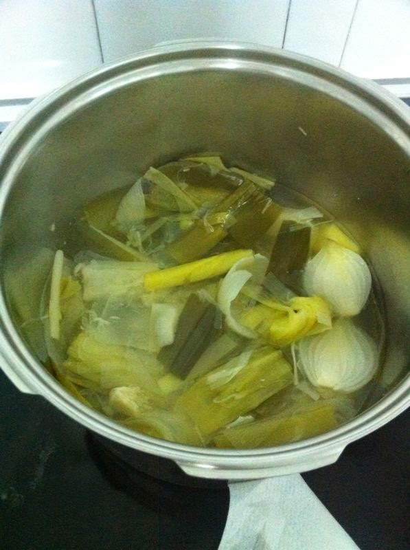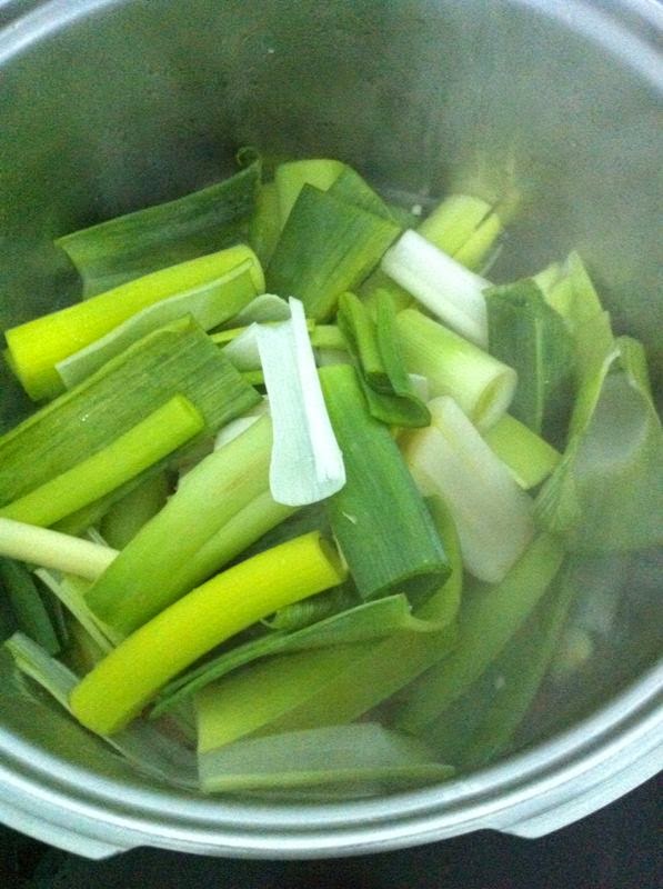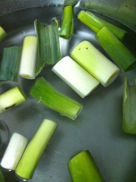 Ahora, lavaremos con abundante agua los puerros entre sus capas, para que salga la tierra y la suciedad. Y los echaremos también a la olla, dejando un tronco mediano de este para laminar y freír después para emplatar.