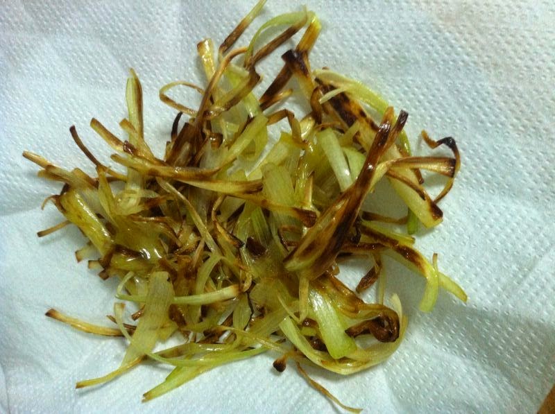 Ya dorado el puerro, lo sacaremos a escurrir a un plato con papel absorbente.
