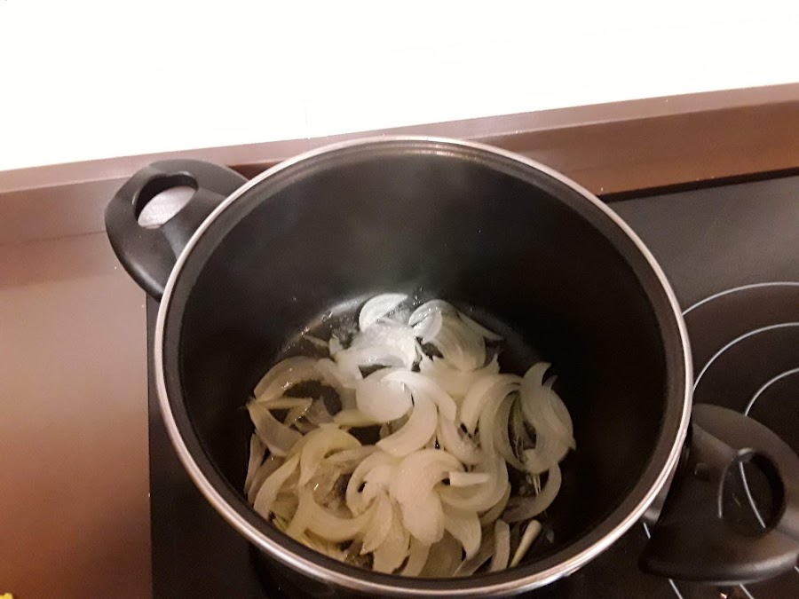 En primer lugar cogeremos una cazuela ponemos un chorrito de aceite y ponemos al fuego a medio fuego, ahora cogemos la cebolla, la pelamos, lavamos y cortamos en medias lunas y ponemos a pochar con el aceite y una pizca de sal,