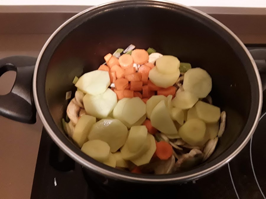hacemos lo mismo con las zanahorias, pelamos, lavamos y cortamos en trocitos pequeñitos e incorporamos, de vez en cuando removemos para que no se nos pegue, mientras se va haciendo pelamos las patatas y las cortamos en trozos de 1 cm. de espesor más o menos, cuando estén pochados los champiñones incorporamos las patatas, removemos, y vamos ya a poner el agua, junto con el agua echamos media cucharita de las de café de cúrcuma y 2 vueltas de molinillo de pimienta,