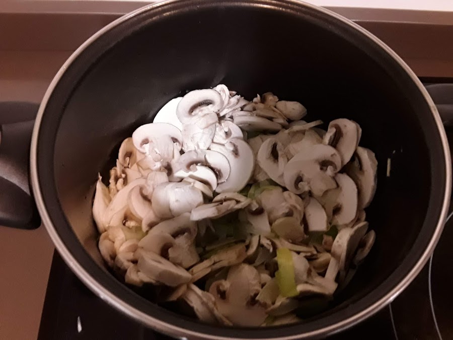 ahora cogeremos los champiñones y los lavamos y cortamos fileteando, cuando veamos que se haya pochado lo anterior incorporamos los champiñones y tapamos con una tapa la cazuela,