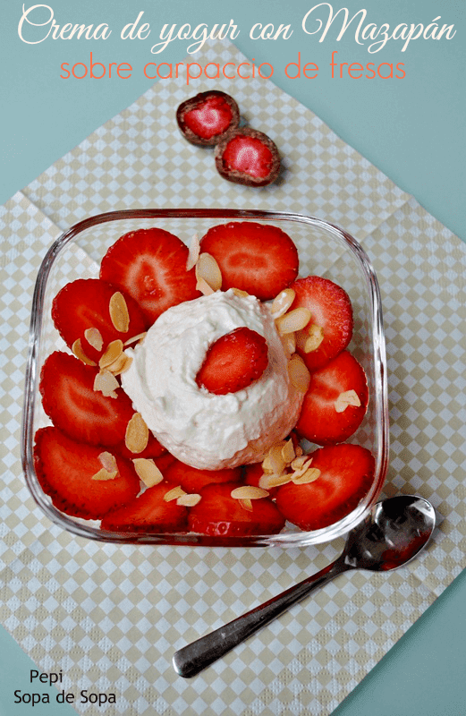 Ablandar la gelatina en agua muy fría. Cortar la masa de mazapán en dados y triturarla con la leche. Mezclarle al triturado el yogur y el azúcar en polvo. Escurrir la gelatina y derretirla en un cazo a fuego muy suave o con cuidado en el microondas. Mezclarle una cucharada de masa de mazapán y verter luego éste sobre el resto de la masa. Meterlo dentro de la nevera mientras montamos la nata (crema de leche).