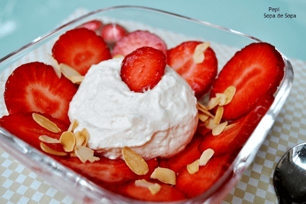 Antes de servir limpiar las fresas y cortarlas finamente en láminas. Mezclarle el azúcar vainillada y el licor de fresas. Tostar las almendras en una sartén sin grasa y dejarla enfriar.