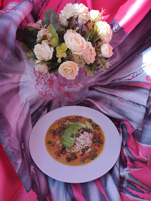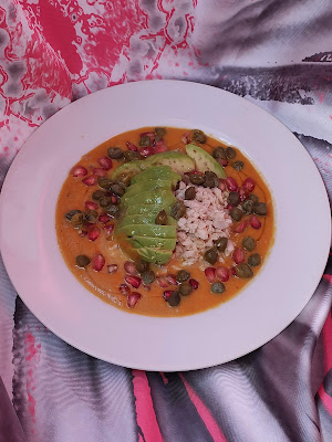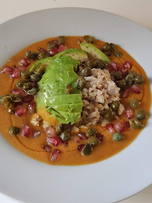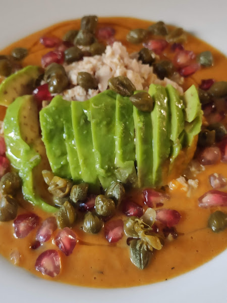 De base la crema y por encima colocamos un montoncito del picadillo de pollo, el aguacate cortado el láminas finas, y repartido por el plato las alcaparras y los granos de granada. Echamos un chorrito de aceite por encima y ya lo tenemos listo.