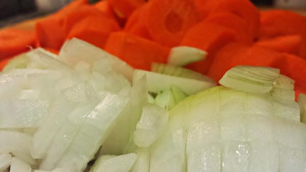 Pelamos las zanahorias y la cebolla y las troceamos. Echamos aceite en una cacerola y cuando esté caliente añadimos la zanahoria, removemos un par de minutos y agregamos la cebolla. Rehogamos durante 5 minutos. Pasado este tiempo añadimos agua que cubra las verduras, salamos y dejamos cocer 30 minutos a fuego medio.