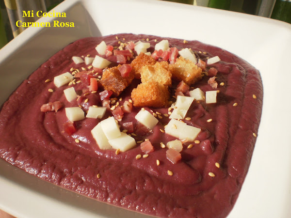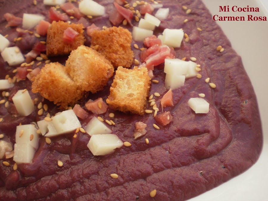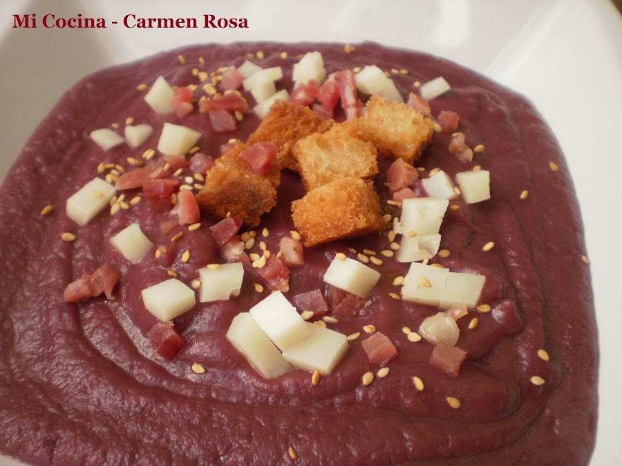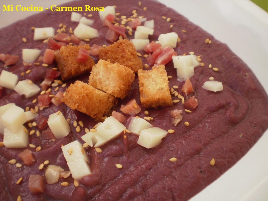 La he preparado bien espesita….es como a mi me gusta, para tomar caliente, le he incorporado queso de cabra curado (malagueño por supuesto), jamón y cuscurrones de pan frito. Y para recordar los sabores de Andalucia, ése toque de ajonjolí….