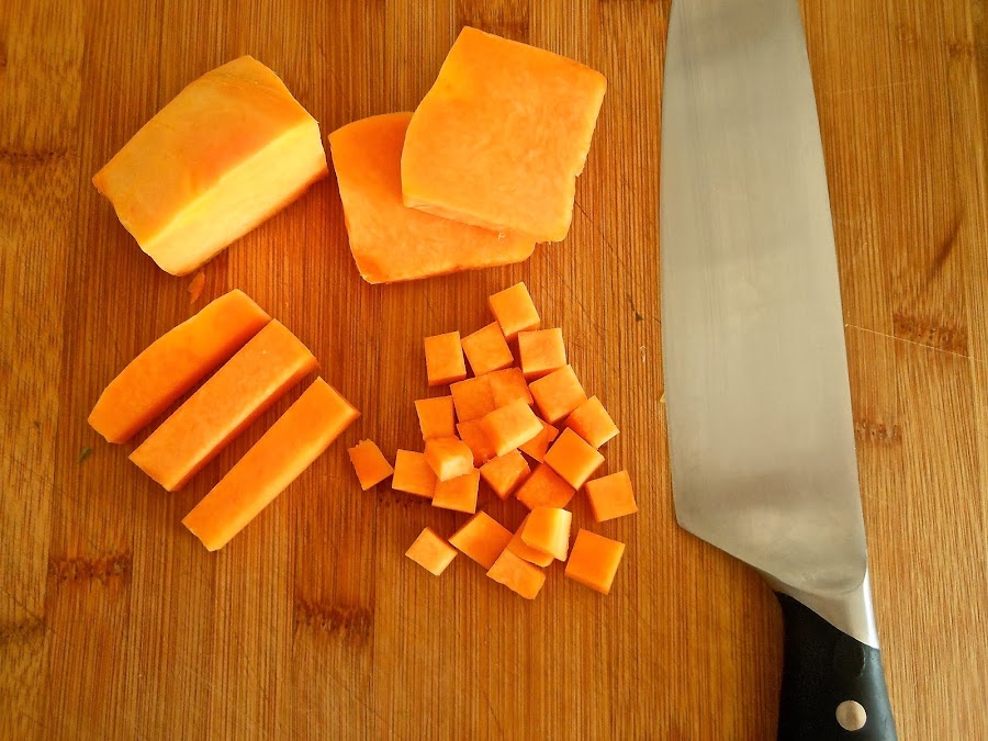 Mientras tanto, quita la piel de la calabaza y córtala en dados. Lo que yo hago es cortar la calabaza en trozos pequeños y después con la ayuda de un cuchillo le voy cortando la piel, así me es más fácil.