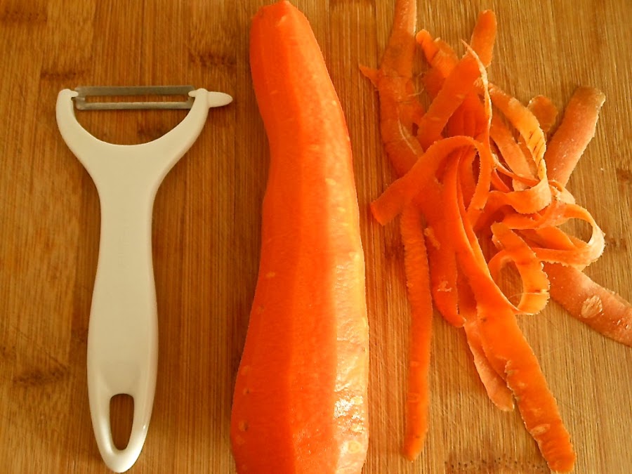 Seguidamente, pela las zanahorias con la ayuda de un pelaverduras o de un cuchillo pequeño y córtala en rodajas.