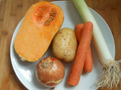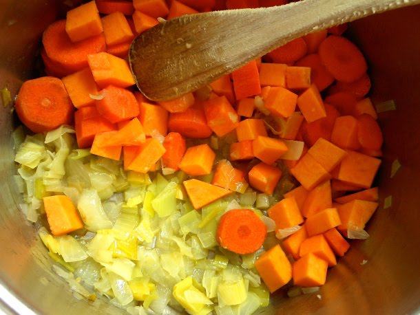 Transcurrido el tiempo, agrega a la cacerola la calabaza y las zanahorias picadas y rehógalas durante 3 minutos.