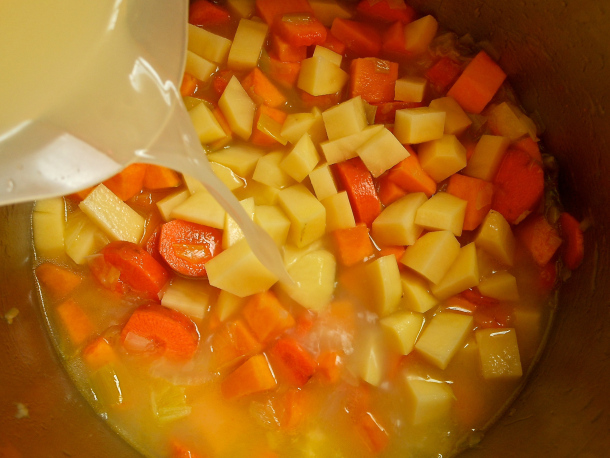Después vierte el caldo de pollo y déjalas cocer durante 15 minutos o hasta que las verduras estén tiernas.