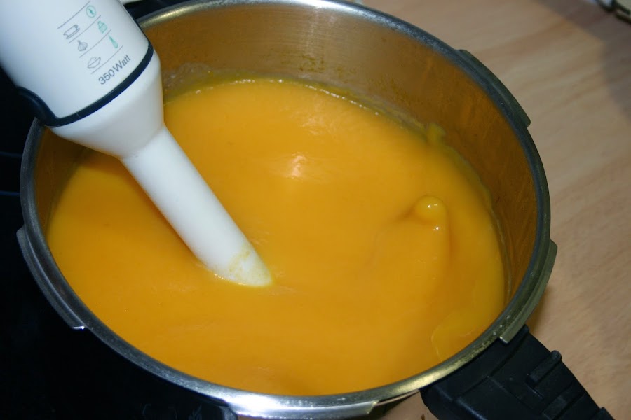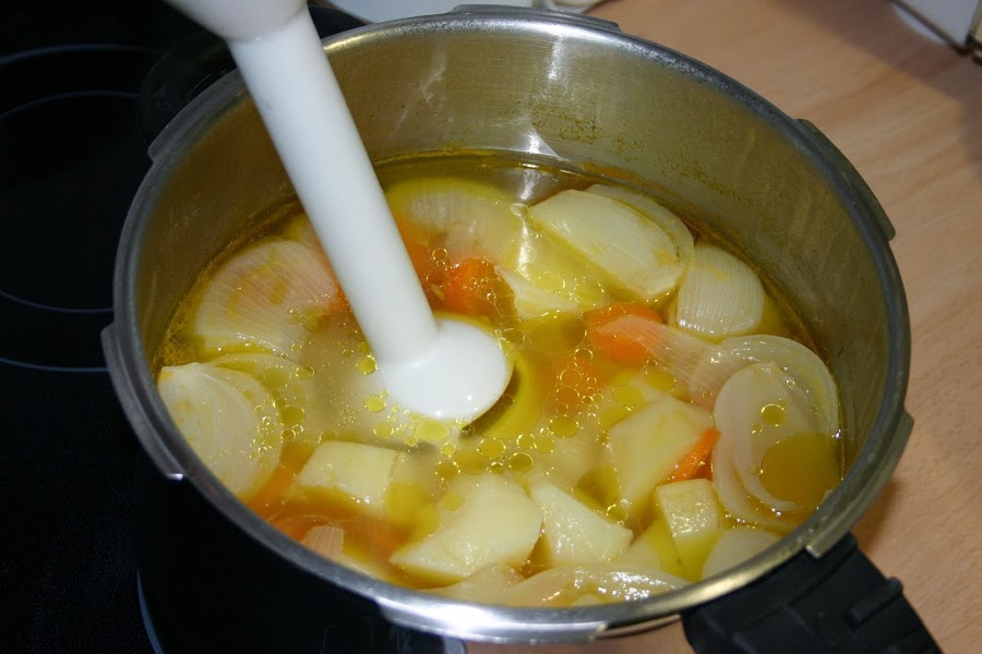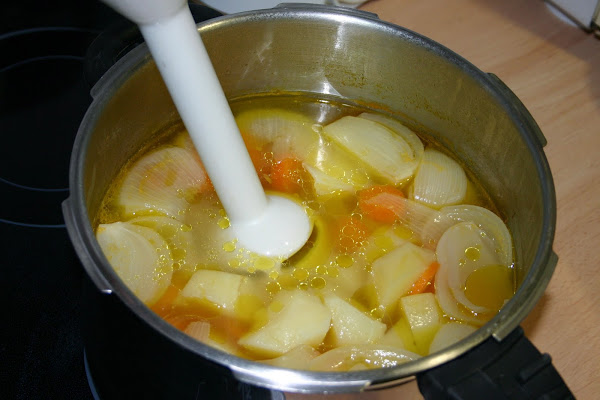 una vez que este todo cocido, lo dejamos templar un poco y pasamos una batidora