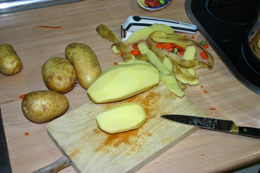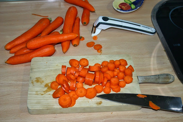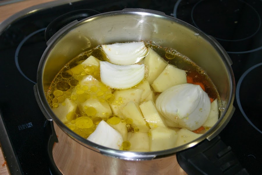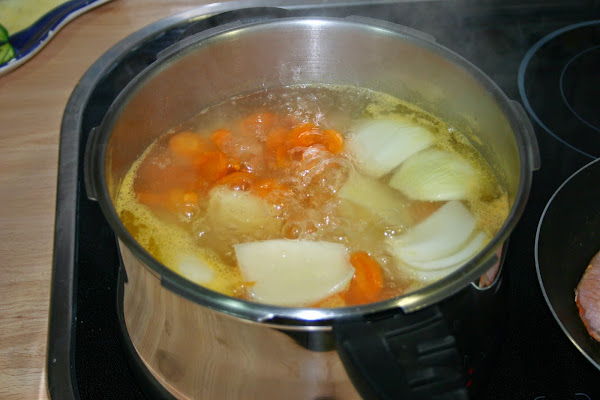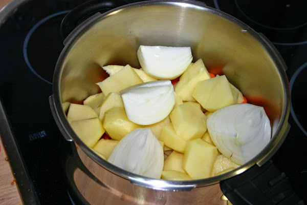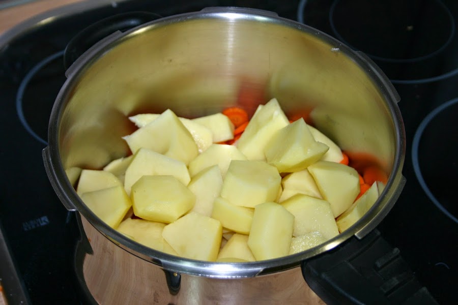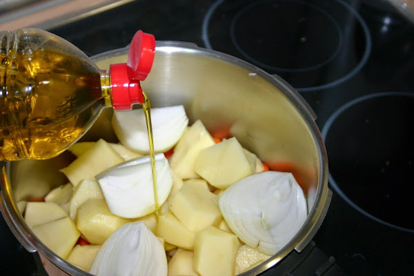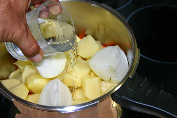 hasta cubrir las patatas y las zanahorias, no os paseis con el agua que luego quedara liquido