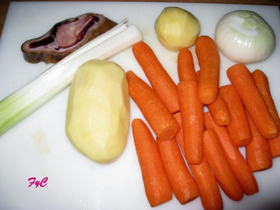 1 bolsa de zanahorias de 1 kg, 1 puerro, 1 cebolla, dos patatas, 1 hueso de jamón ibérico, AOVE, sal y cuando tengo le pongo tambien un trozo de calabaza.
