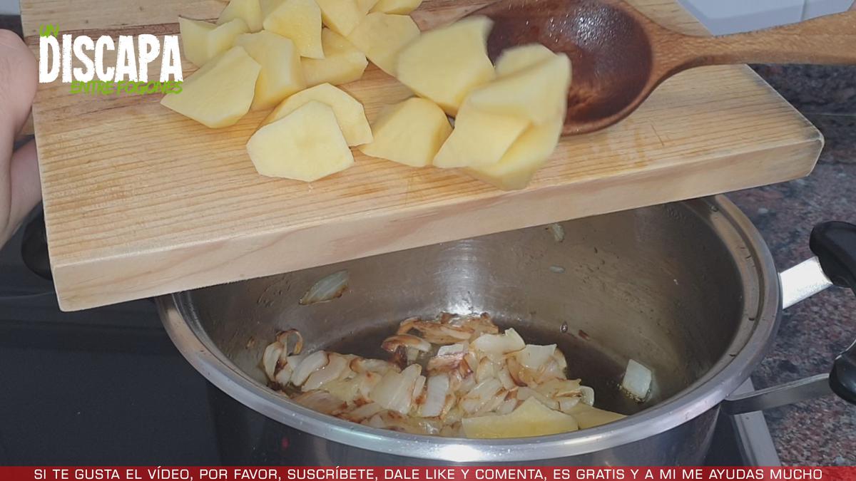 Y cuando la cebolleta ha cogido un poco de color le añadimos las patatas y dejamos que se rehogue unos 5 minutos.
