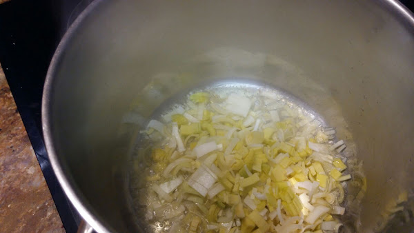 Cortamos la parte blanca del puerro por la mitad, lavamos bien y cortamos en rodajas.