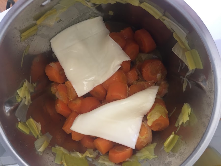 Después, añadimos los dos quesitos y batimos toda la zanahoria. Si vemos que la crema es muy espesa podemos añadir un poco del caldo que hemos retirado, batimos y ¡¡YA ESTÁ LISTA PARA TOMAR!!