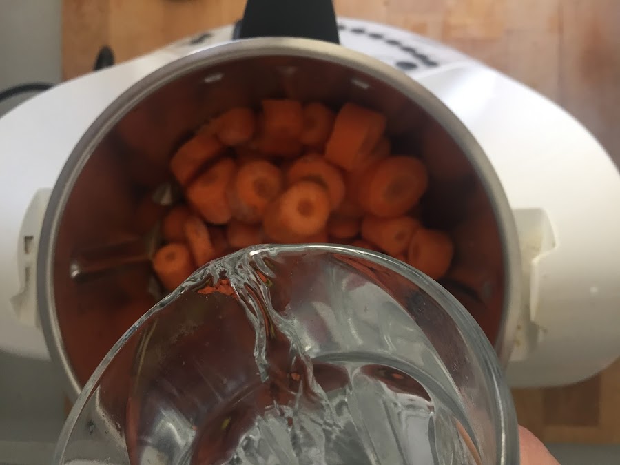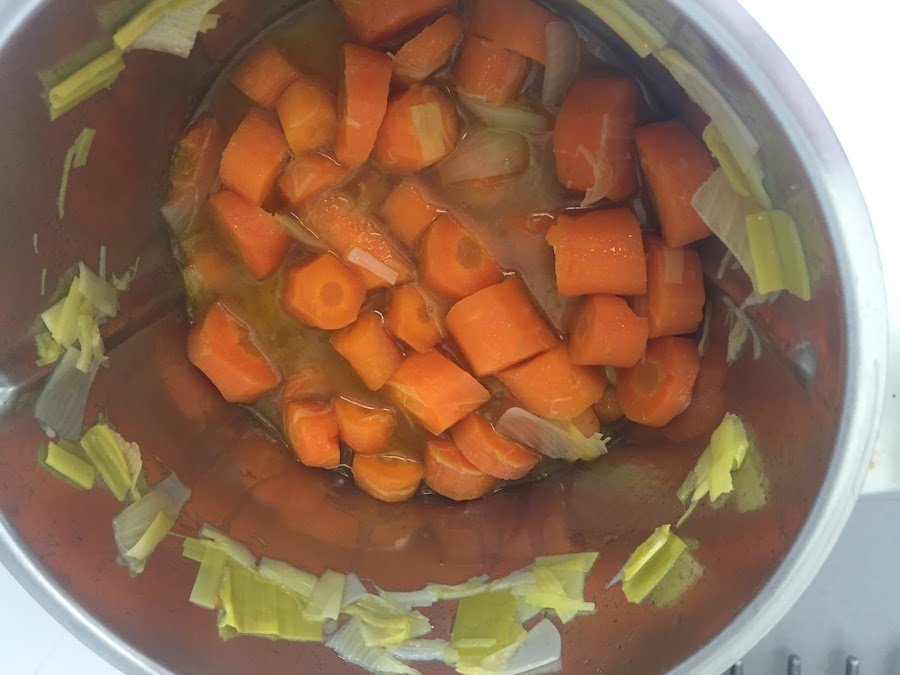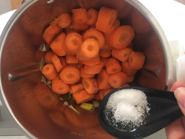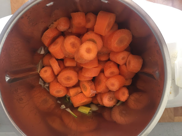 Mientras podemos pelar y cortar las zanahorias, para echarlas posteriormente a la olla. Salpimentamos al gusto y añadimos el agua. Dejamos que todo cueza a fugo medio durante unos 20 o 30 minutos.