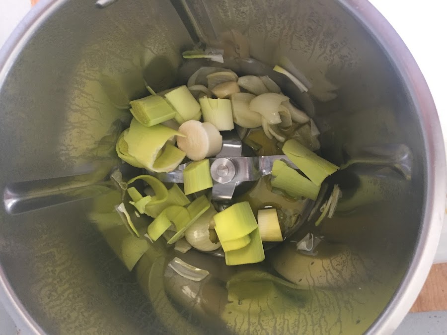 Primero pelamos y picamos la cebolla y los dientes de ajos, y los rehogamos con un poquito de aceite. Pasados unos cinco minutos, cortamos y añadimos los puerros para que se rehoguen también.