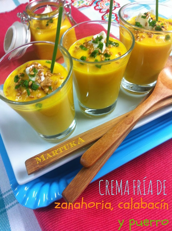 Le he puesto un topping de queso de cabra, cebollino y sésamo garrapiñado que le da un toque muy fresco y actual. Si lo presentas en forma de chupitos, como en la foto, también tendrás un entrante para una cena o lunch informal.
