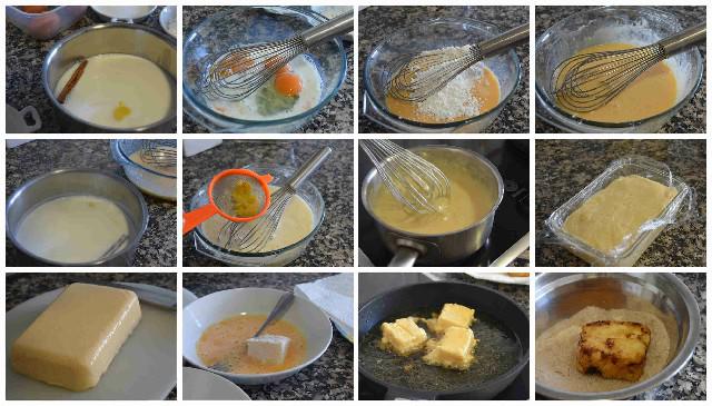 Pasamos la crema frita ligeramente por harina, luego por huevo batido y freímos por tandas en aceite caliente, cuando este dorada le damos la vuelta y dejamos que se dore de nuevo.
