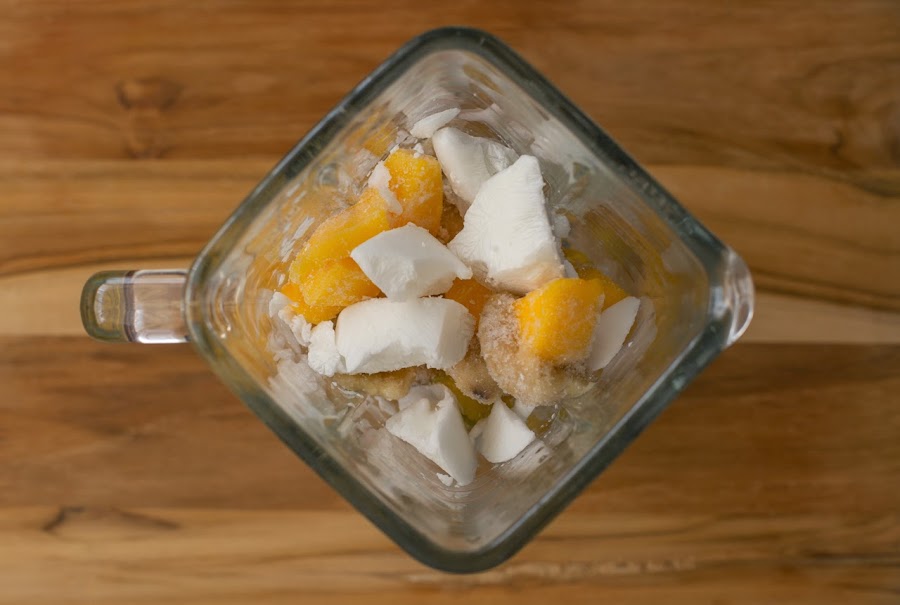 Lavar las frutas, quitar las cáscaras, cortarlas en trozos y llevar a congelar junto con la crema de coco. Al momento de estar superantojados de un heladito, sacar los ingredientes del congelador, ponerlos en la licuadora y licuar hasta que alcancen la textura de heladito, (muy importante licuar por intervalos para no dañar la licuadora, pueden ayudarse de un chorrito de agua o de leche de coco), invitar a un amiguito y servir.