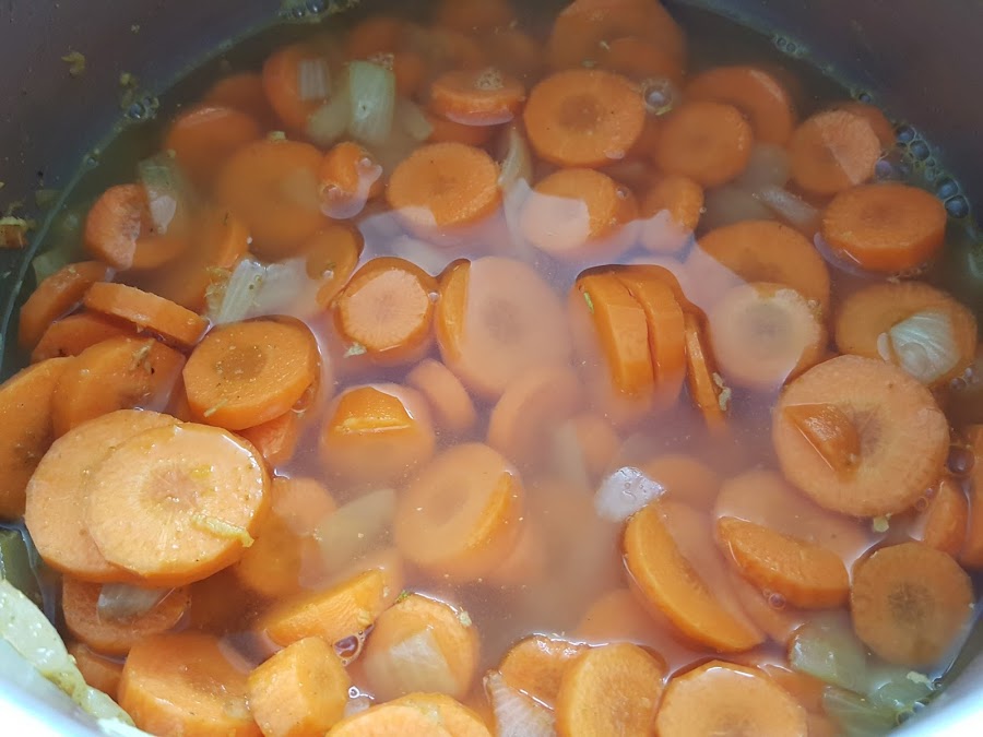 4. - Le añadimos el agua, la pastilla de caldo o sal y dejamos cocinar unos 25 o 30 minutos, hasta que la zanahoria esté tierna.