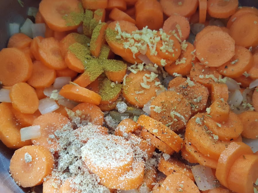 3. - Cuando la cebolla empiece a tomar color, le añadiremos la zanahoria, las especias, el gengibre rallado y la sal o la pastilla de caldo y removemos un poco.