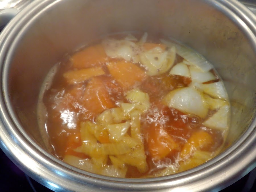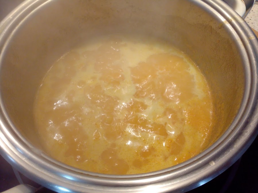 Llevar a ebullición y dejar cocer a fuego lento durante quince minutos. Comprobar que la verdura esté tierna y si es así, triturar todos los ingredientes de forma que quede lo más fino posible. Añadir a continuación en ése caldo, la leche de coco y la mantequilla, llevando nuevamente a ebullición.