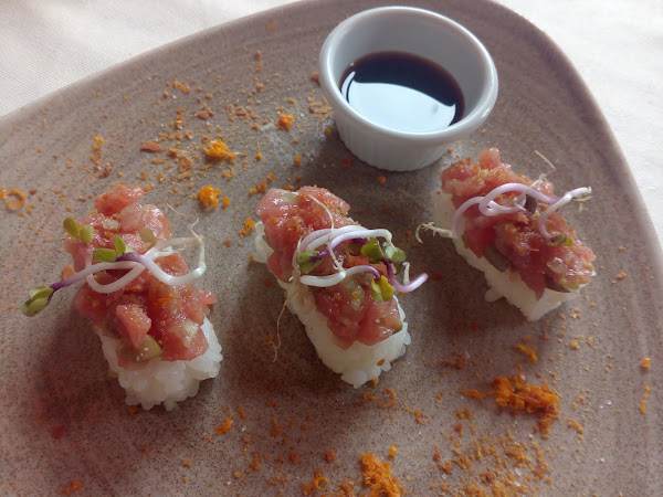 JORGE MORENO VIVAR (OASIS CLUB - COCINA JAPONESA): Oributoro Niguiri con ralladura de naranja y aceitunas aloreñas, sal miso y germinado de rábano.