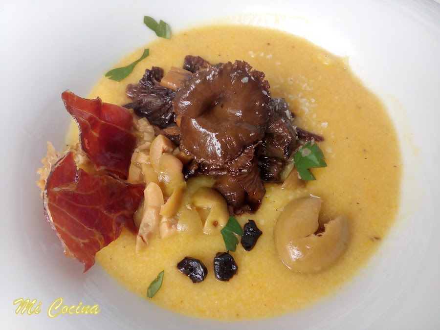 Verter la crema en un plato hondo sopero. Colocar las setas salteadas en el centro, junto con el picadillo de las aceitunas aloreñas, adornar con el jamón serrano y aceitunas aloreñas entera (quitándoles previamente el hueso). Espolvorear con coco rallado y perejil picado.