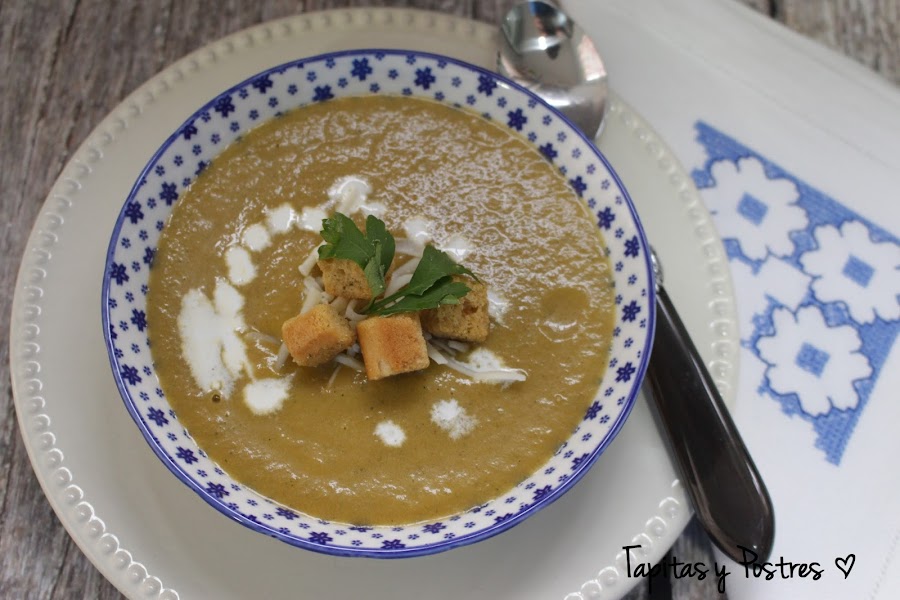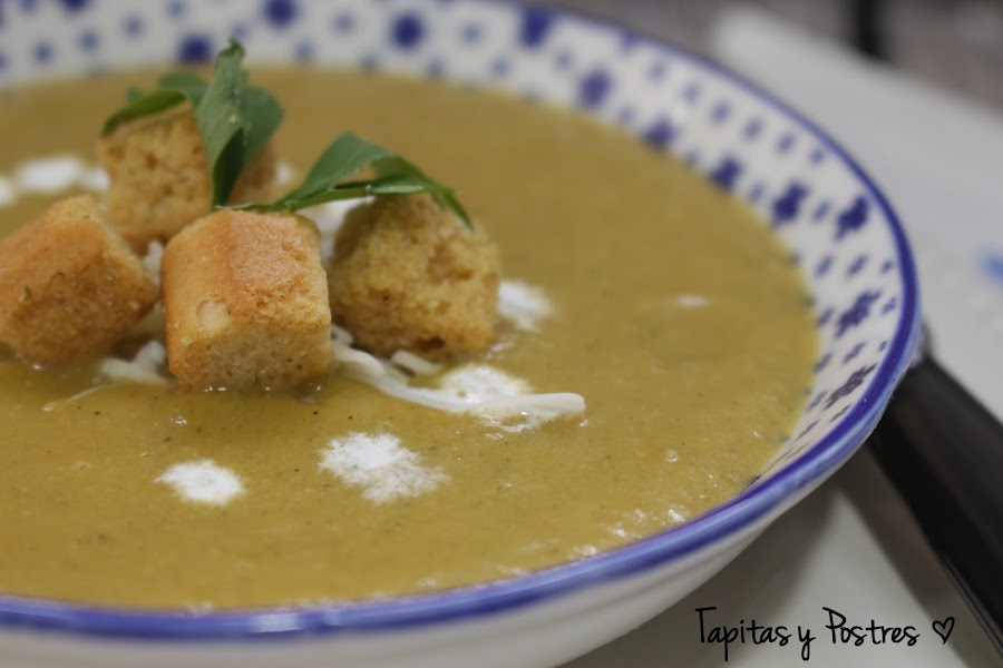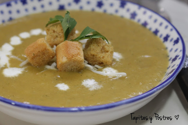 Una crema suave y muy rica y al igual que la sopa, ligera, pues no lleva mas grasa que dos cucharadas de aceite y al estar elaborada con agua hemos restado bastantes calorías. Yo la he acompañado de unos picatostes y una cucharadita de queso rallado. Ambas cosas se pueden suprimir si estáis a dieta, aunque la cantidad es insignificante.