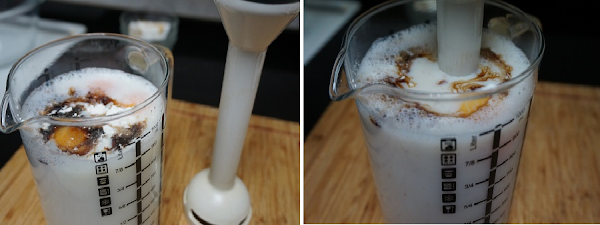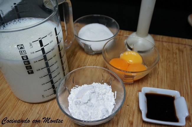 En un bol ponemos la leche, la harina de maíz, los huevos y la esencia de vainilla. Batimos con la batidora hasta que esté todo integrado y sin grumos.