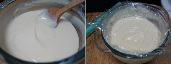 Volvemos a sacar, removemos y si aún no esta la crema la volvemos a poner un minuto y así hasta que quede cremosa. La tapamos con papel film, quedando el plástico pegado a la superficie de la crema. La guardamos en la nevera si la queremos que quede fría.