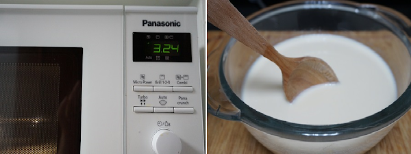 Ponemos el bol al microondas a 800W de potencia 3 minutos. Sacamos, removemos y volvemos a meter al microondas a la misma potencia 2 minutos.