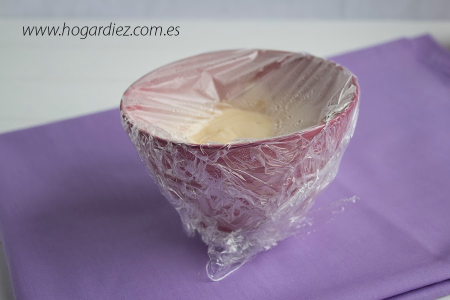 La crema pastelera si queréis guardarla en la nevera y que no se os ponga fea, podéis taparla con papel film de forma que el papel film quede tocando la crema, como os enseño en la imagen. Así se conservará perfecta de un día para otro.