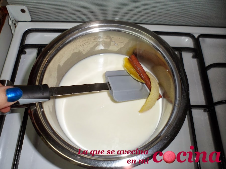 En un cazo: leche, piel limón y rama canela a fuego medio.