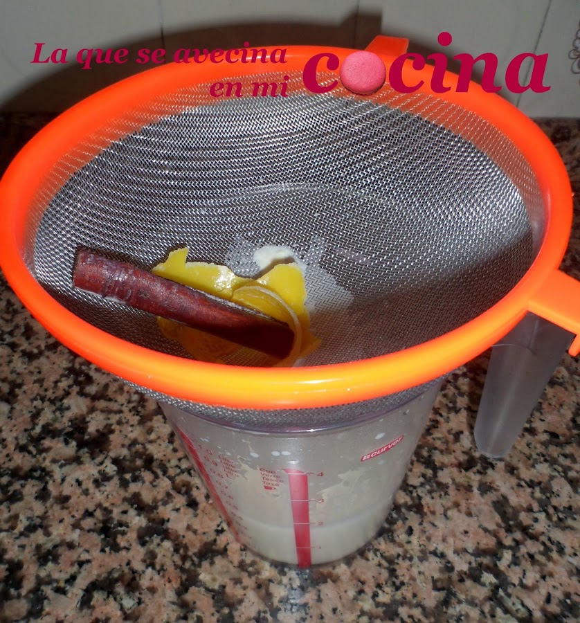Cuando la leche ya haya hecho la "infusión" con la piel del limón y la canela, nos dispondremos a colarla.