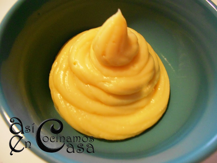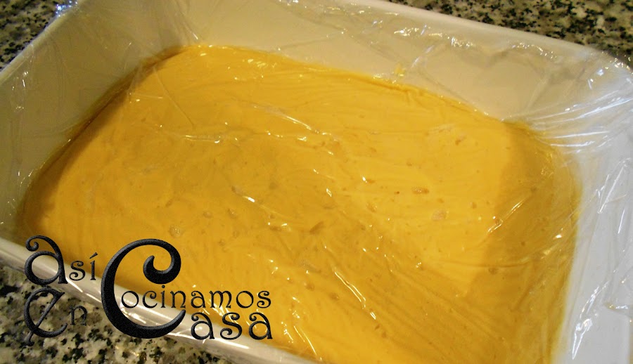 A fuego lento, no dejamos de remover hasta que espese. Son unos minutos, hay que tener un poquito de paciencia, que al final espesa. Cuando tengamos la crema en el punto que nos guste, la vertemos toda en una fuente amplia y le pondremos un film transparente pegado para que no nos haga costra. La pondremos en la nevera unas horas, hasta que esté bien fría.