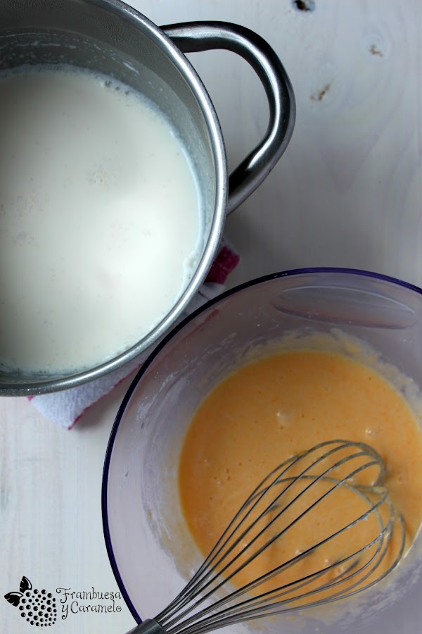 3. Colamos la leche (muy importante para evitar grumos por la nata (crema de leche) que se produce al hervir la leche) y la incorporamos poco a poco a la mezcla de las yemas sin dejar de remover