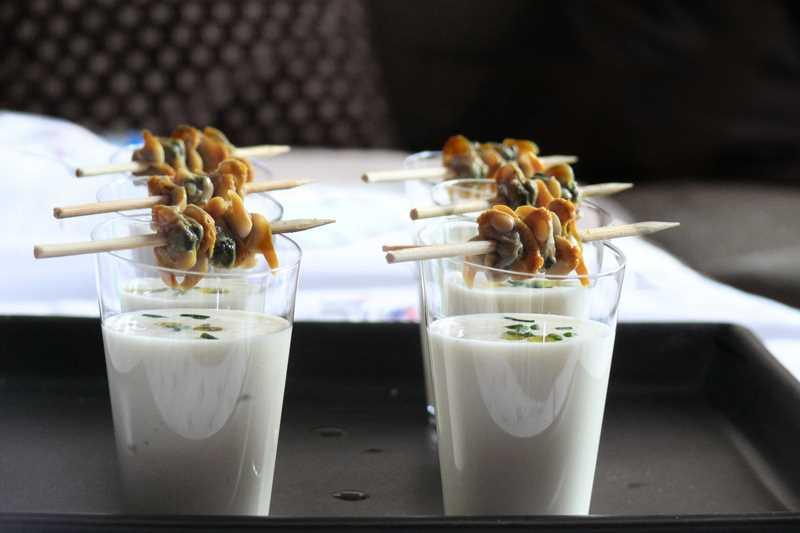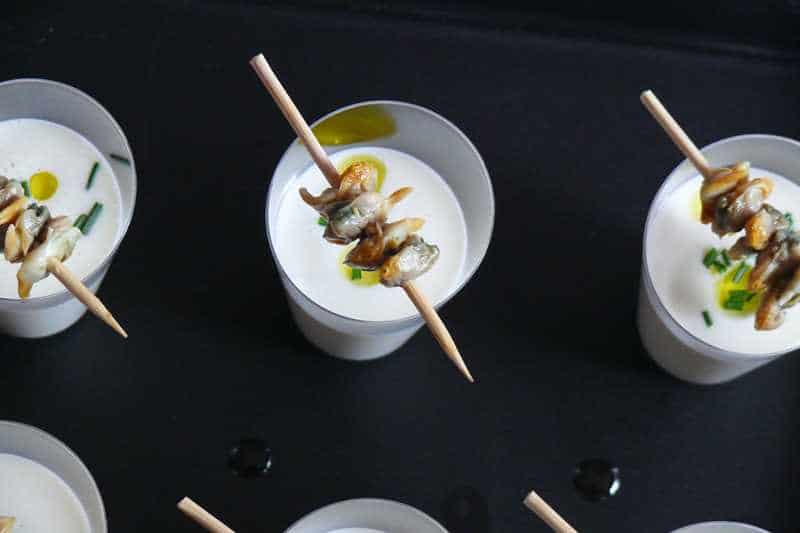 Servimos la crema tibia en vasitos individuales, decoramos con unas gotas de aceite de oliva virgen extra y cebollino picado y colocamos encima un palillo con los berberechos.