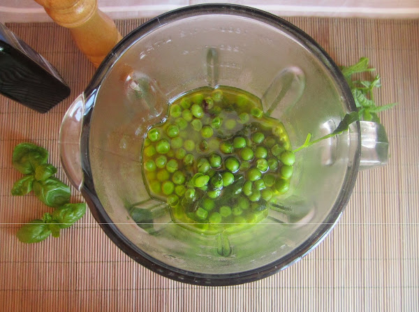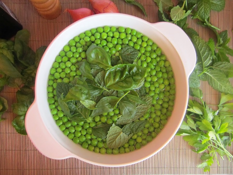 1. Llena una cazuela con agua fria y pon a cocer los guisantes junto a la menta, la albahaca y una pizca de sal.