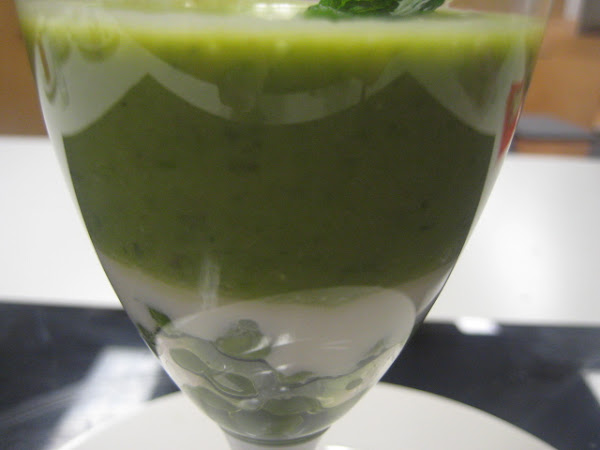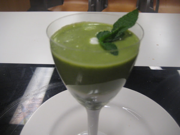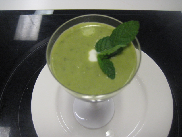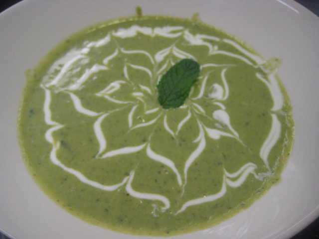 Preparación: Pelar el diente de ajo y sofreír en un poco de aceite que habremos puestos en una cacerola. Una vez dorado, agregar las verduras lavadas y troceadas y dejar que se sofrían unos momentos. Así las cremas salen más sabrosas. Una vez salteadas añadir un poco de sal, de cebolla en polvo y mojar con el caldo que tengamos. Es mejor ir agregando para que al final la crema no quede muy líquida. Dejar cocer durante unos 30 minutos. Retirar del fuego y añadir el puré de patatas, las hojas de hierbabuena y triturar. Poner a punto de espesor , de sal y pimienta y añadir la mitad de la nata (crema de leche) o el yogur. El resto lo empleamos para la decoración o presentaciones. Una vez puesta a punto la crema ya se puede tomar. Puede consumirse fría o caliente y en las fotos he puesto dos formas de presentarla.