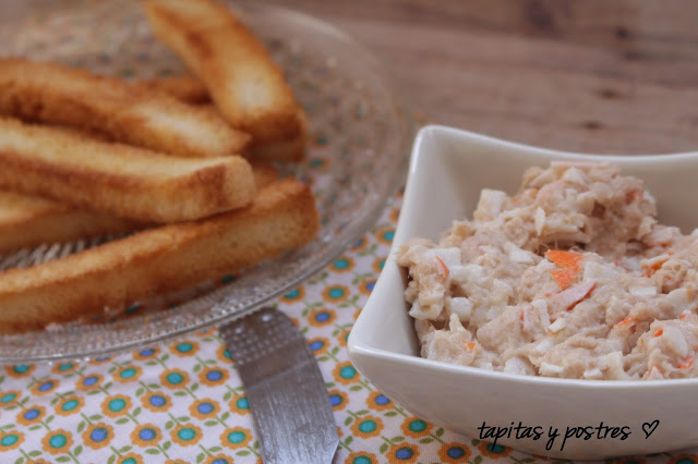 Crutones de pan y paté del mar Qué delicia nos ha preparado María José en su blog, Tapitas y Postres... Para preparar los crutones de pan solo tenemos que cortar rebanadas de pan de molde sin corteza a lo largo, los pincelamos con aceite y los horneamos hasta que estén crujientes. Por otra parte batimos gambas cocidas, palitos de cangrejo, atún en conserva y mayonesa. Untamos esta pasta, que debe quedar con tropezones, sobre los crutones de pan... y a disfrutar!