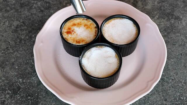 7º Una vez tengamos la Creme Brulee le añadimos por la superficie azúcar quedando totalmente cubierta. Con la ayuda de un soplete vamos a quemar el azúcar de modo que se quede totalmente dorado lo metemos en la nevera como mínimo 2 horas.