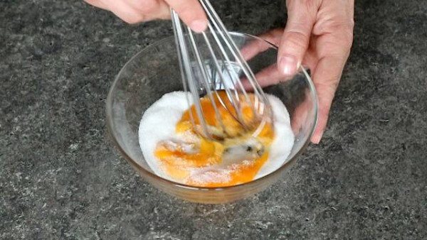 1º Separamos las yemas de las claras de los huevos, solo vamos a necesitar las yemas. Una vez tenemos las yemas le añadimos el azúcar y con la ayuda de un batidor manual lo mezclamos hasta que quede una mezcla blanca.