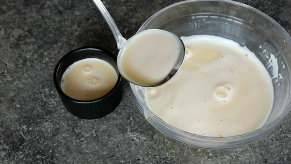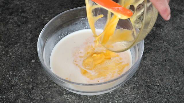 5º Vamos añadiendo las yemas de huevo poco a poco a la mezcla de leche y nata (crema de leche) y mezclamos suavemente.